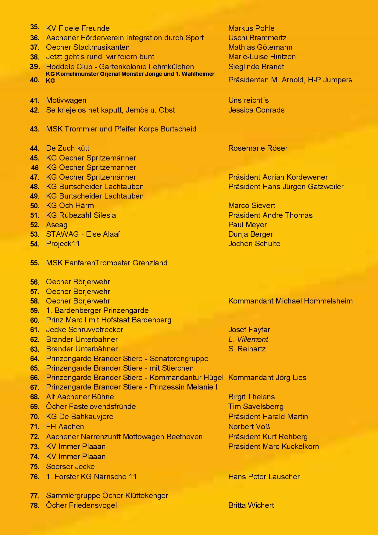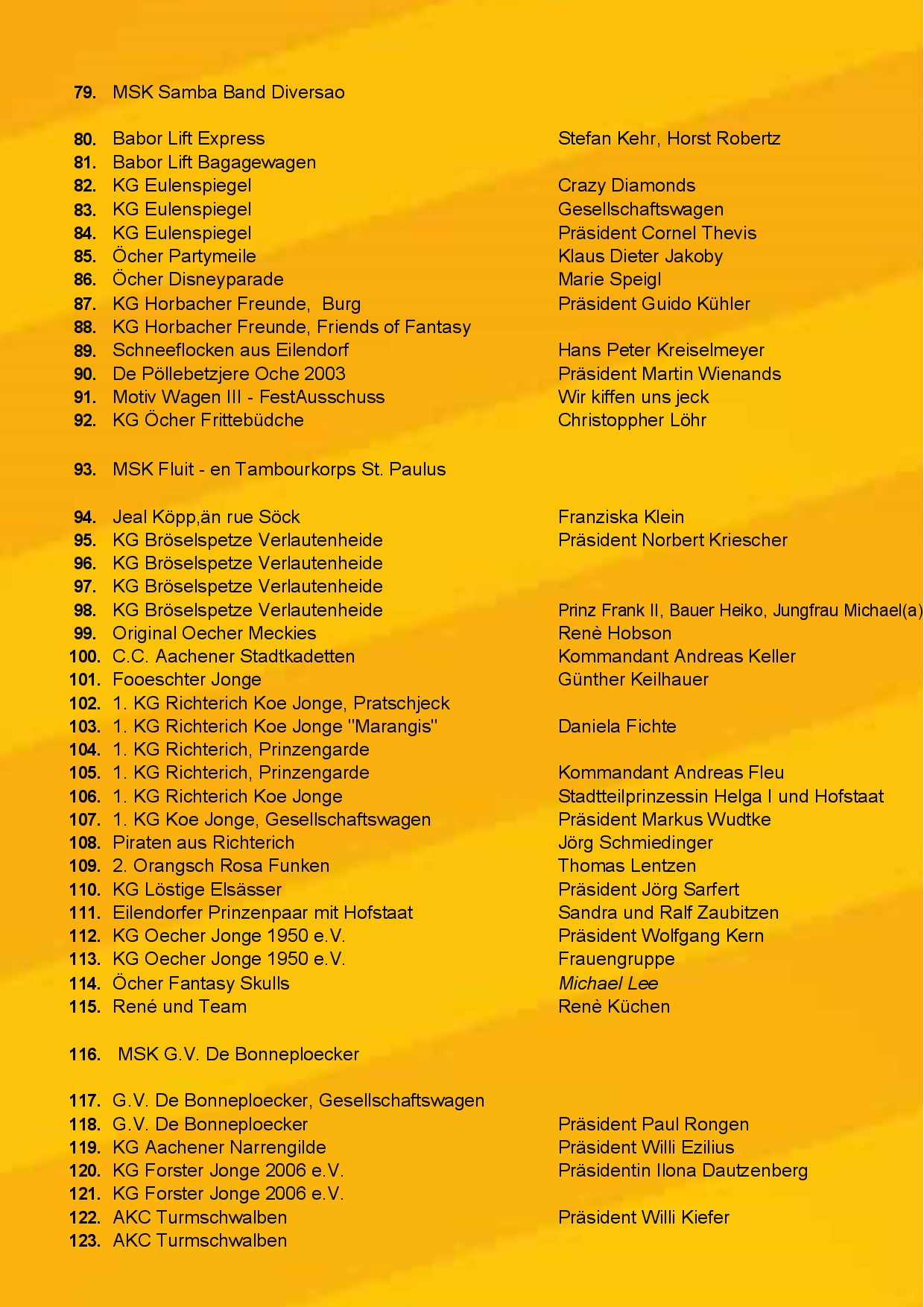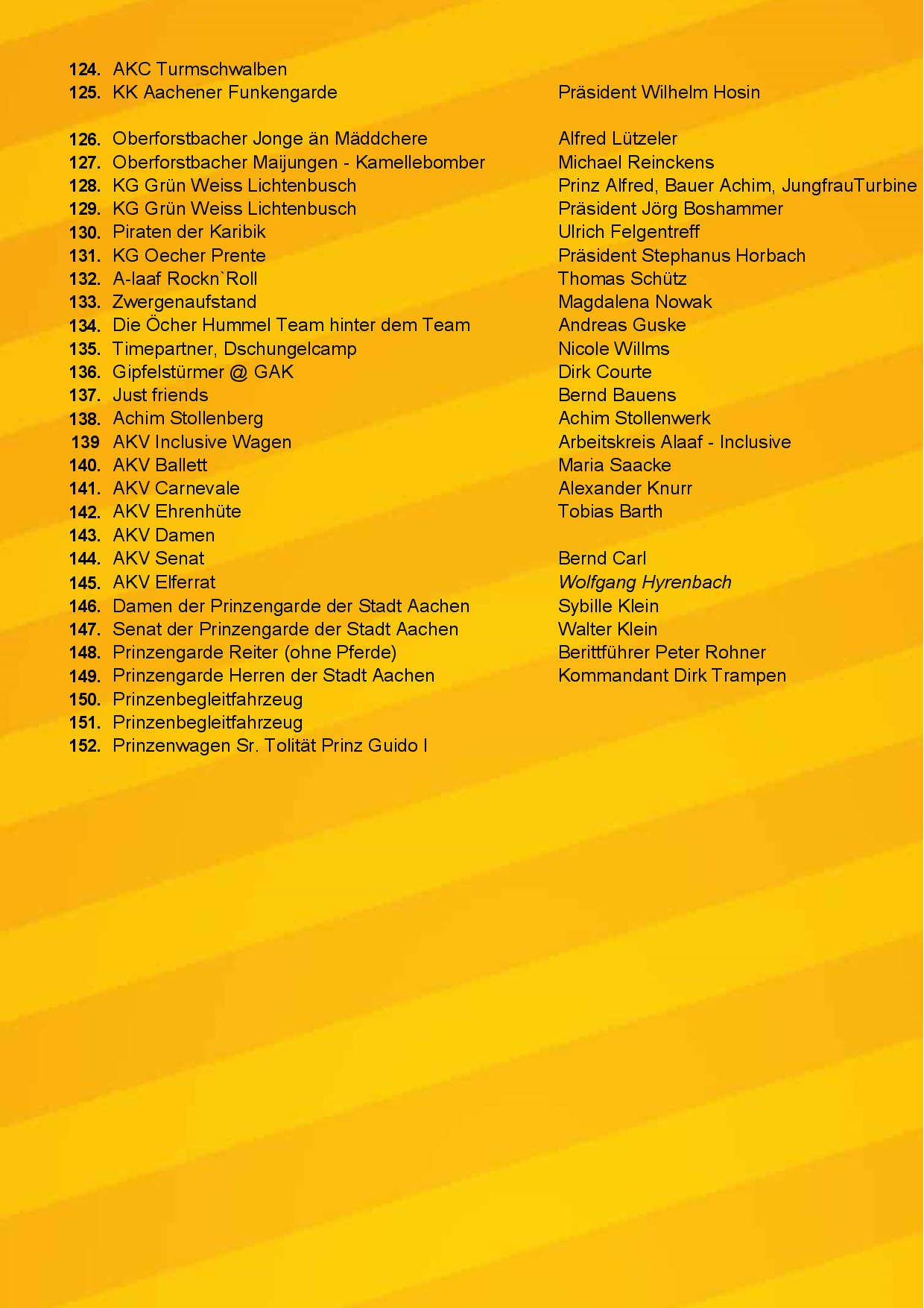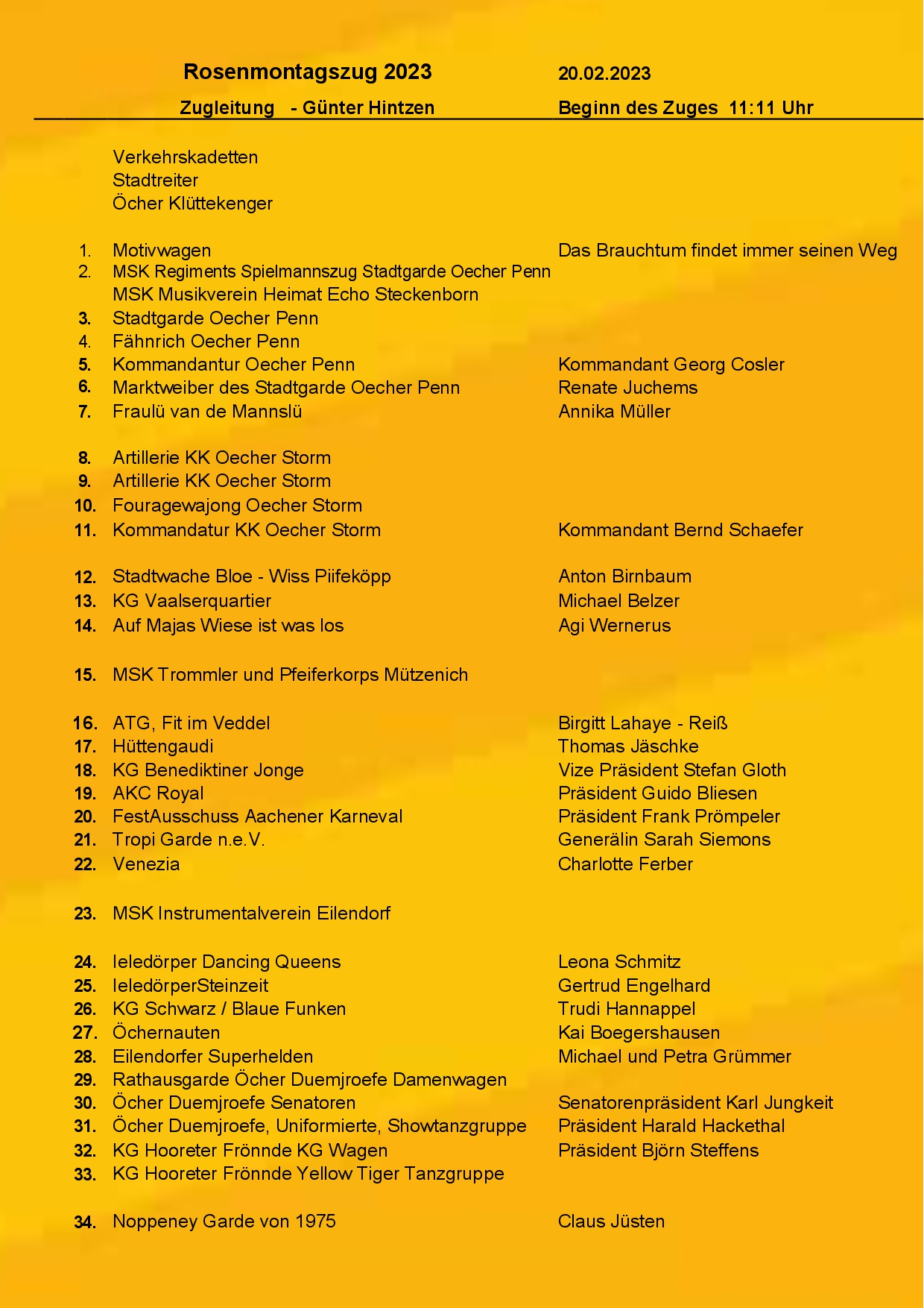 Zugfolge für den Rosenmontagszug 20.02.2023