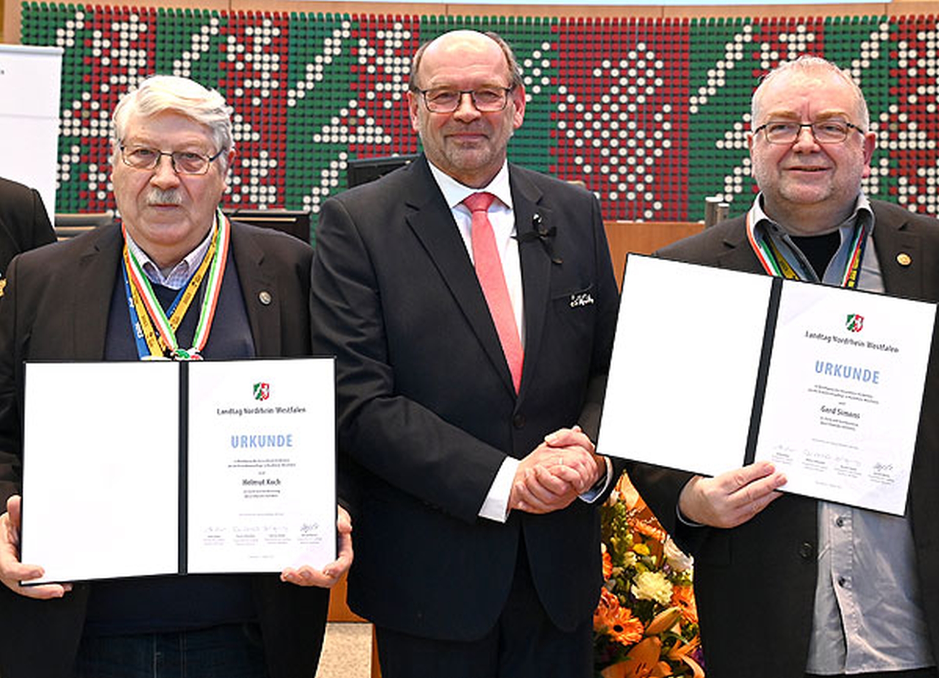 gratuliert der Präsident des Landtags, André Kuper. Er überreichte den Geehrten gemeinsam mit Vizepräsident Rainer Schmeltzer und Vizepräsident Christof Rasche die