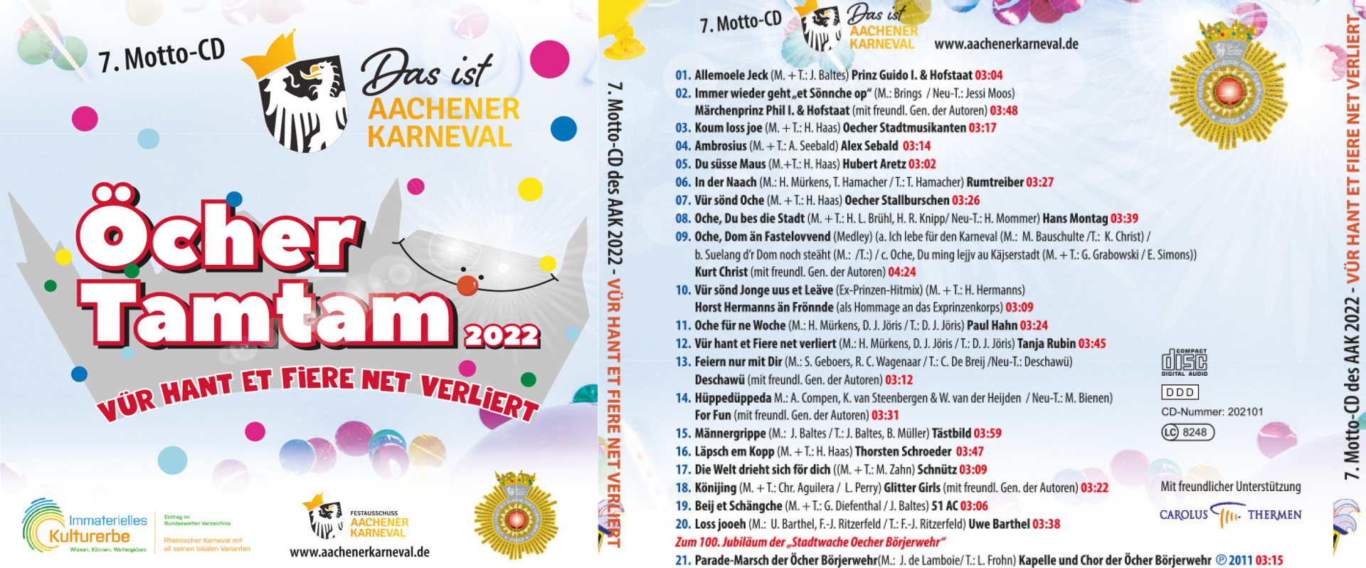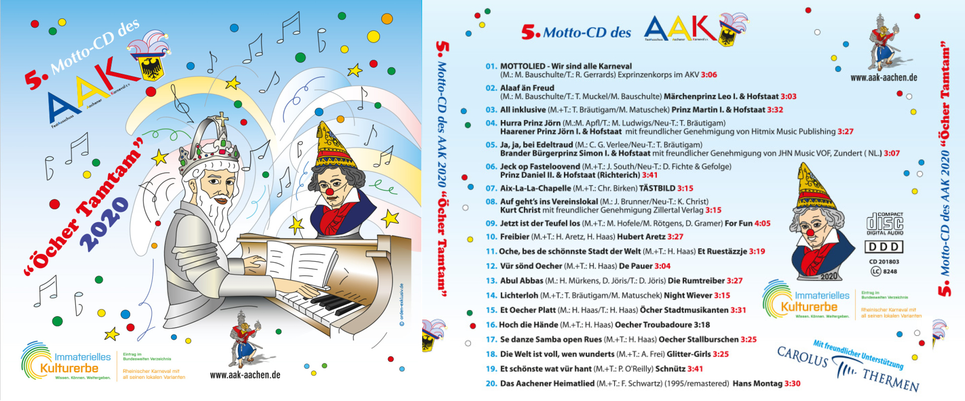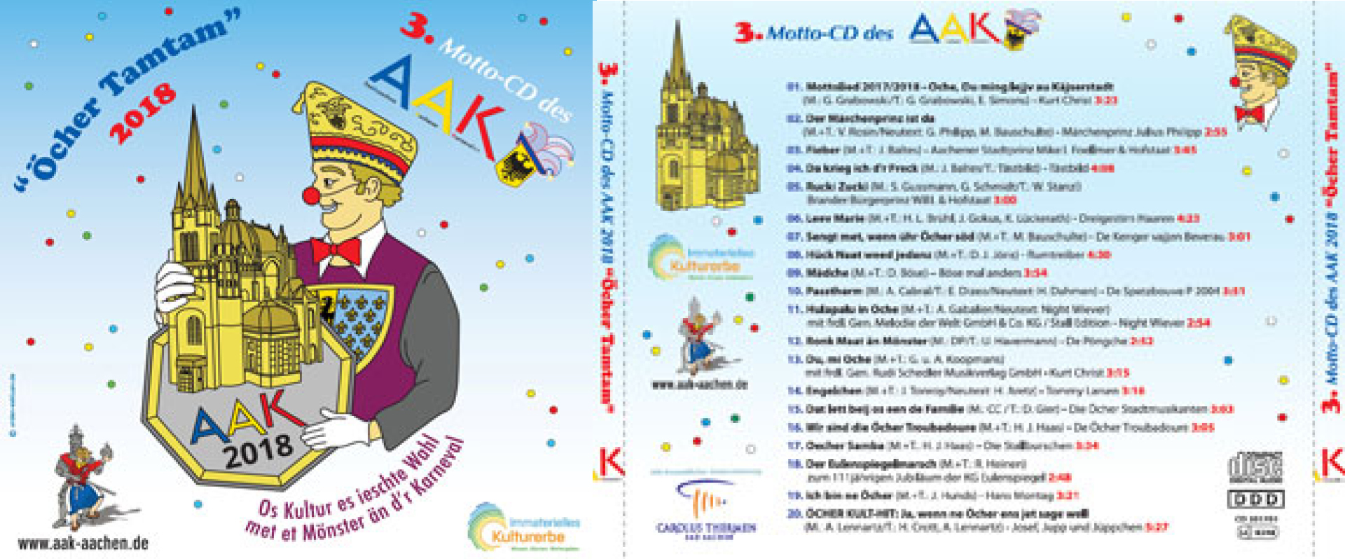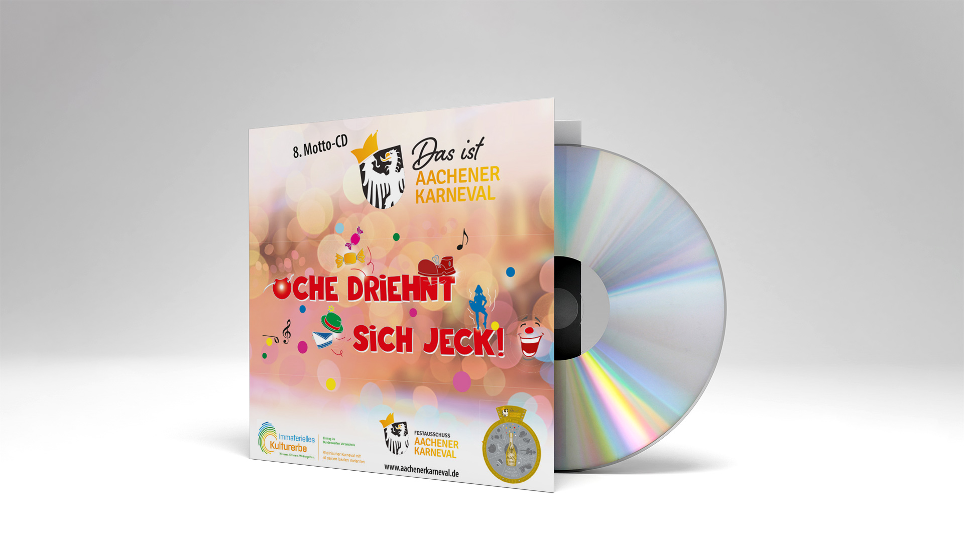Passend zum jeweiligen Karnevalsmotto des Jahres bringen wir unsere beliebte und schon zur Tradition gewordene Motto-CD raus. Damit der Karneval, gute Laune und Spaß Sie das ganze Jahr durch begleiten – bis zur nächsten CD im neuen Jahr. Die Motto-CD spiegelt auch die große und gute Bandbreite der Öcher Auftretenden wieder.