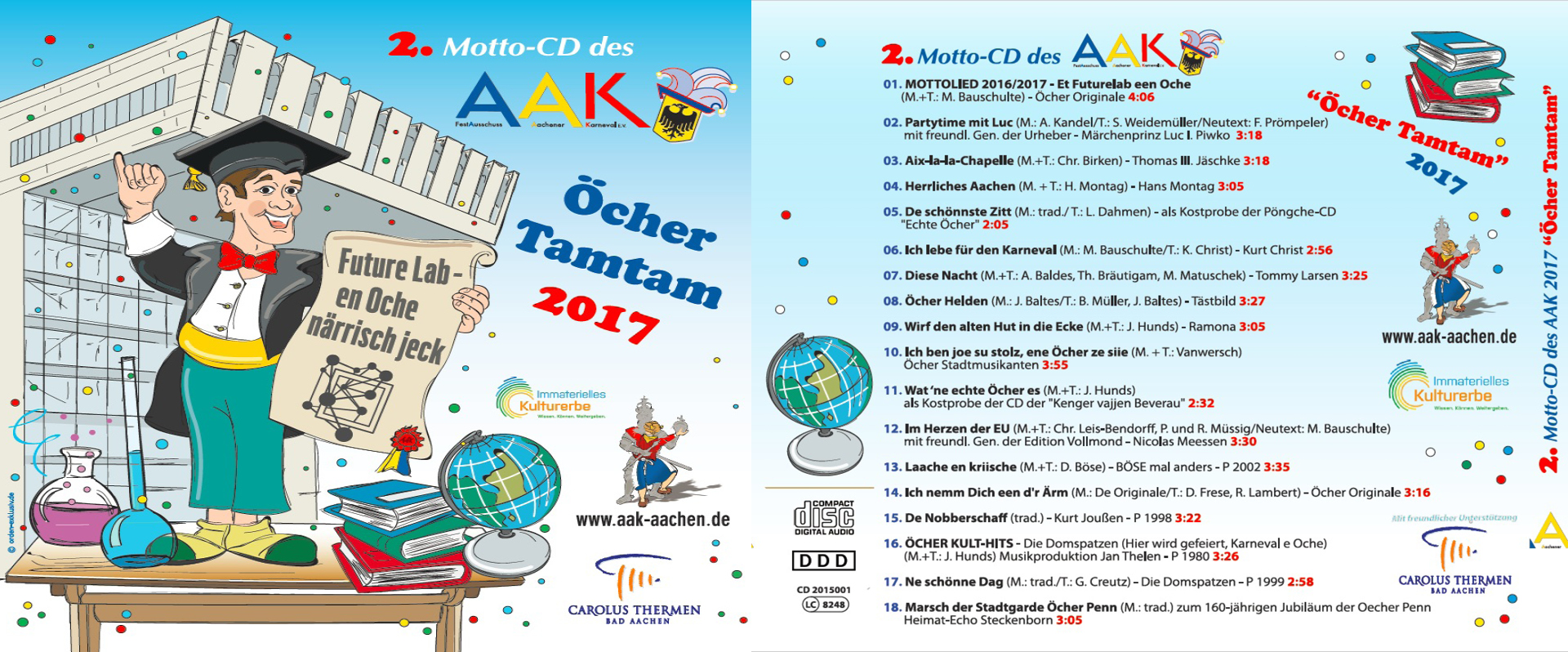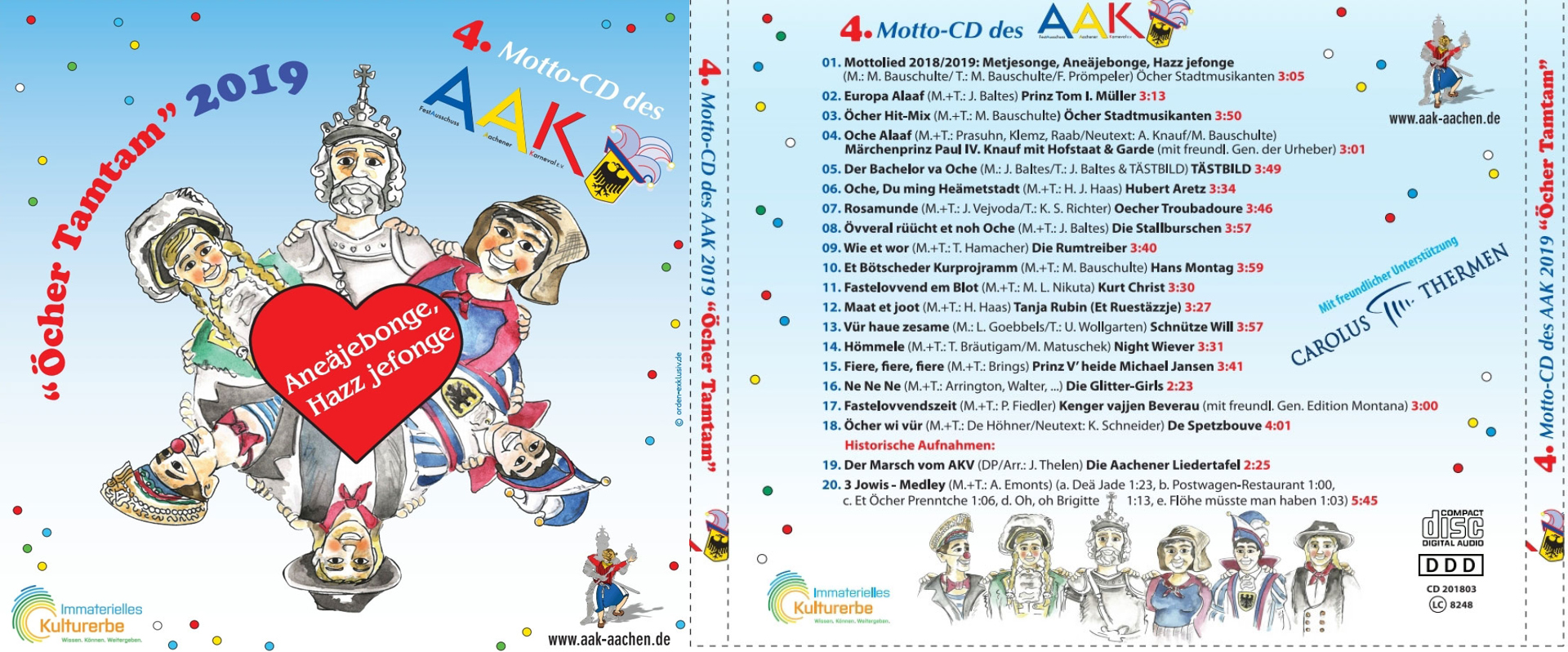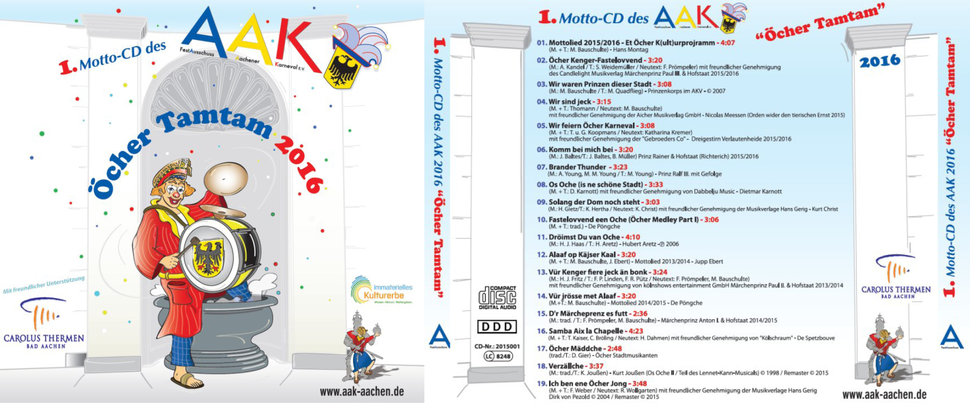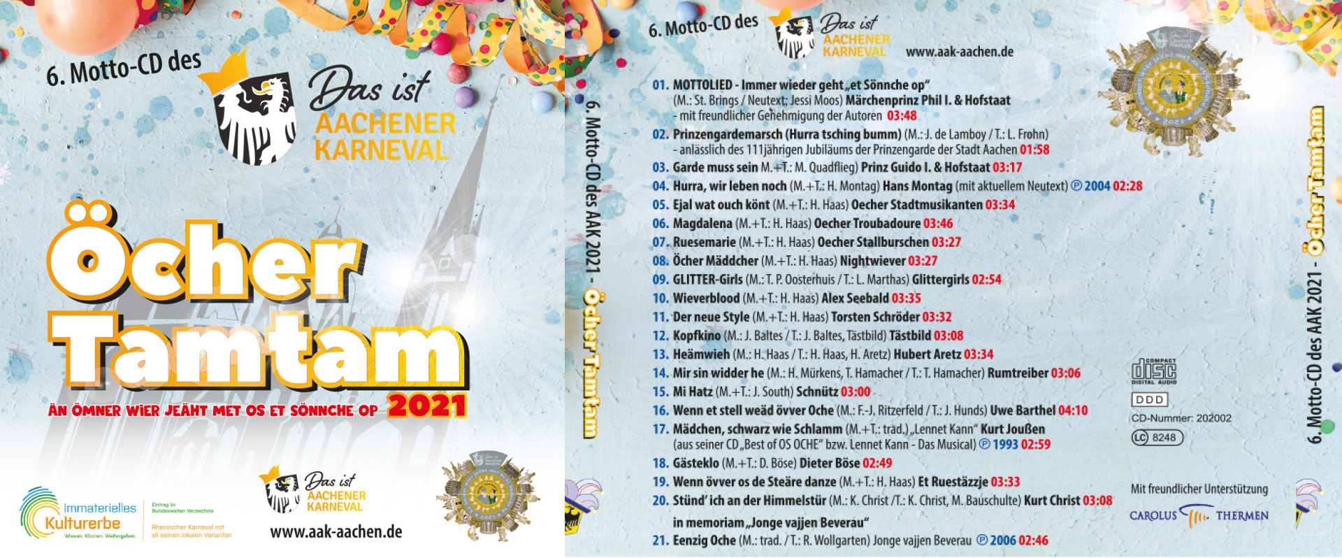 Passend zum jeweiligen Karnevalsmotto des Jahres bringen wir unsere beliebte und schon zur Tradition gewordene Motto-CD raus. Damit der Karneval, gute Laune und Spaß Sie das ganze Jahr durch begleiten – bis zur nächsten CD im neuen Jahr. Die Motto-CD spiegelt auch die große und gute Bandbreite der Öcher Auftretenden wieder.