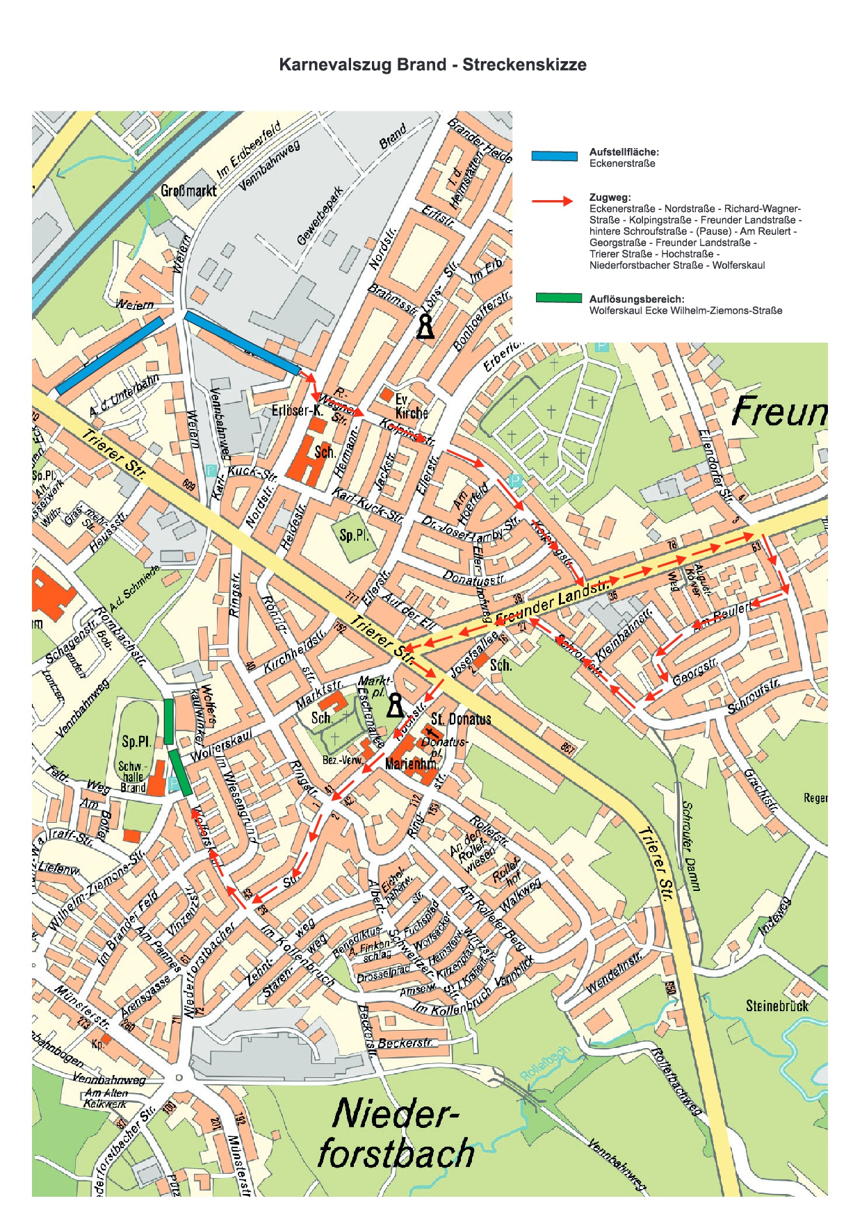 Eckenerstraße (Aufstellung), Richard-Wagner-Straße, Kolpingstraße, Freunder Landstraße, Schroufstraße, Am Reulert, Georgstraße, Schroufstraße, Freunder Landstraße, Trierer Straße, Hochstraße, Niederforstbacher Straße, Wolferskaul (Auflösung)