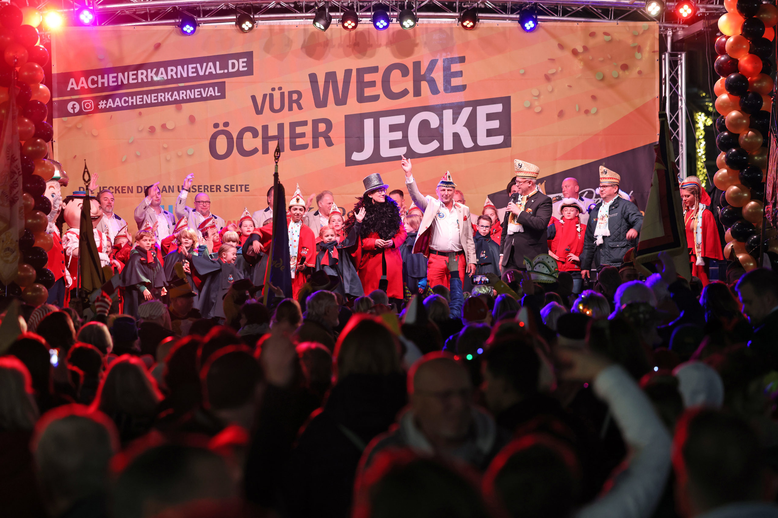 Vor einigen Jahren hat der Vorstand des AAK sich auf die Fahne geschrieben in Aachen einen Sessionsauftakt als Openair-Veranstaltung durchzuführen. Zusammen mit dem Stammtisch Aachener Präsidenten und Kommandanten, die bereits am Willy-Brandt-Platz mit einer solchen Veranstaltung Erfahrung gesammelt hatten, führt man nun am 11.11. eines Jahres den Sessionsauftakt „Vür wecke Öcher Jecke“ durch. Heute kann man ein abwechslungsreiches Programm präsentieren in dem neben lokalen und regionalen Künstlern auch euregionale Programmpunkte aus dem benachbarten Belgien und der Niederlande zu Gast sind.
