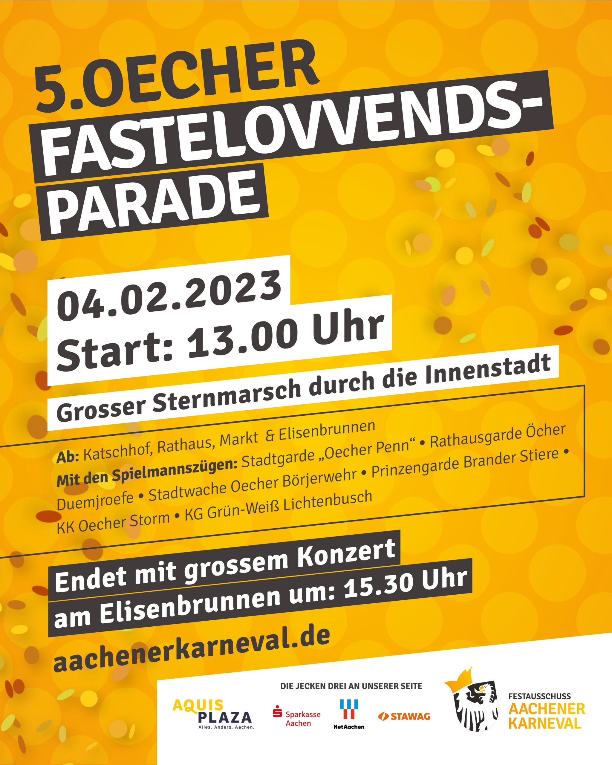 AAK-Vize-Präsident Friedhelm Rademacher von der Stadtgarde Oecher Penn hat das musikalische Programm gestaltet. Teilnehmende Vereine sind die Penn selbst mit ihrem Regimentsspielmannszug und dem Musikzug Heimat-Echo Steckenborn, die Rathausgarde Öcher Duemjroefe mit dem Musikverein Oberforstbach, die Stadtwache Oecher Börjerwehr mit ihrem Musikzug, die Prinzengarde Brander Stiere mit ihrem Spielmannszug, das KK Oecher Storm mit dem Musikverein Kalterherberg sowie die KG Grün-Weiß Lichtenbusch mit ihrem Musikzug.Das Warm Up spielt die Stadtwache Oecher Boerjerwehr um 13 Uhr im Untergeschoss des Aquis Plaza vor dem Sky-Stand im Lichthof. Anschließend folgt der große Sternmarsch aus- gehend vom Katschhof, Marktplatz und Elisenbrunnen bis zum Aquis Plaza. Hier findet von 14 bis circa 15.30 Uhr das große Konzert statt. Begrüßt wird das Publikum von AAK-Präsident Frank Prömpeler und Zuzana Busniakova, Junior Center Manager des Aquis Plaza.