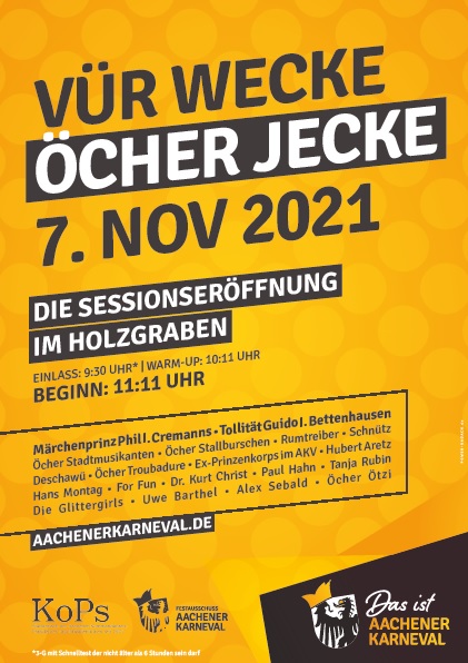 Zusammen mit dem Stammtisch Aachener Präsidenten und Kommandanten veranstaltet der FestAusschuss Aachener Karneval (AAK) am Sonntag, 7. November, ab 10.11 Uhr am Holzgraben die Sessionseröffnung „Vür wecke Öcher Jecke“.